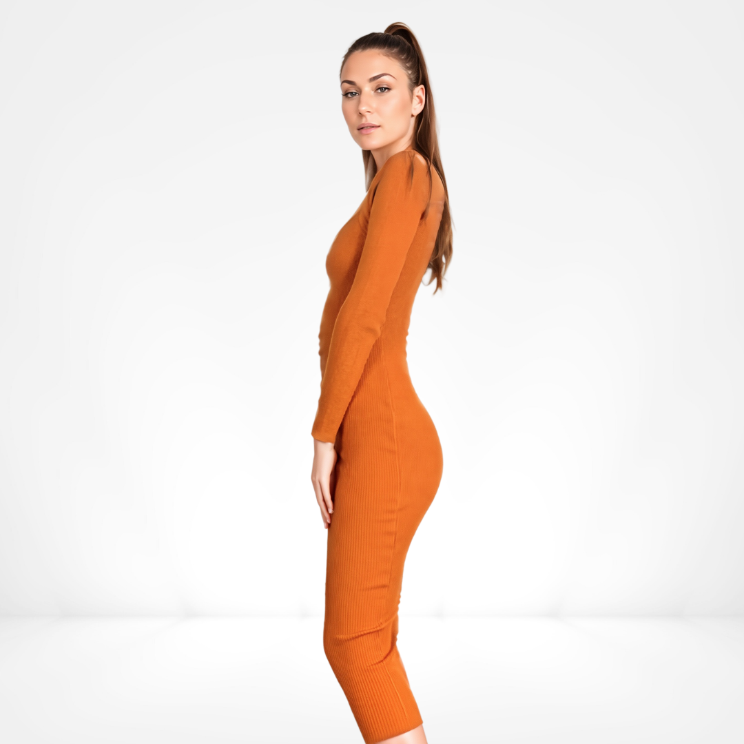 Crafted from a fine ribbed-knit blend, the Ember Embrace sculpts a sleek, body-skimming silhouette while offering gentle stretch for comfort. The integrated shrug sleeves flow seamlessly into the fitted bodice, framing the décolletage with an architectural grace. Pair with slender amber-toned heels and brushed-gold accents to amplify the tactile richness, or balance with a crisp ivory trench for a chic, layered ensemble.